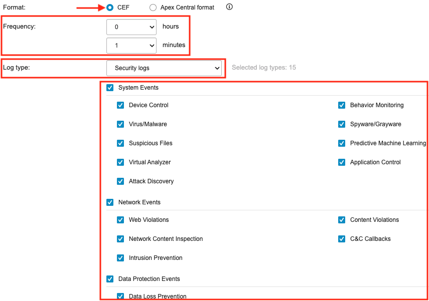 • For Log Type, select Security Logs from the drop-down and select all of the checkboxes.